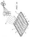 However, brief mention should perhaps be made of the fact that state of the art filters, andfluid filter10, are typically sandwiched between anterior and posterior grid likestructures12, as may be constructed from heavy gauge wire or rods as generally depicted and referenced inFIG. 1.FIG. 2 depicts a posterior grid-like structure12 (without a corresponding anterior grid-like structure12). The drawings being here referenced have been included in this specification for clarity of reference, and no claim is particularly being made the specific construction of thefilter panel assemblies11 or grid-like structures12. Further, it is believed that the grid-like structure12 does not significantly alter the performance of the waveform landscape generally formed upon theanterior filter surface20 of thefluid filter10.