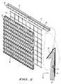 FIG. 1 is a fragmentary perspective view of a portion of a paint booth wall showing a plurality of filter-receiving panel assemblies, one fluid filter according to the present invention in assembled relation with a first panel assembly, and one fluid filter according to the present invention exploded from a second panel assembly.