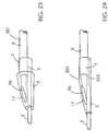 FIGS. 25 to 27 are partially cut-away, perspective views of other delivery catheters according to the invention passing over a guidewire;