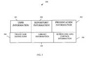 In another embodiment, themetadata data structure300 also includeslibrary information305. Thelibrary information305 acts as a clearing house for information that is desired to be transferred between different instances of themetadata data structure300. Security attributes permit reading and writing against thelibrary information305. Thelibrary information305 permits definitional information orpresentation information303, associated with themetadata data structure300, to be transferred, copied, and/or shared for purposes of creating other instances of themetadata data structure300. Thus, selective portions of themetadata data structure300 may be used to create new copies or instances of themetadata data structure300.