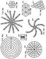 FIG. 36edepicts an exemplary magnetic field emission structure having sources arranged as curved spokes.FIG. 36fdepicts an exemplary magnetic field emission structure made up of hexagon-shaped sources.FIG. 36gdepicts an exemplary magnetic field emission structure made up of triangular sources.FIG. 36hdepicts an exemplary magnetic field emission structure made up of partially overlapped diamond-shaped sources. Generally, the sources making up a magnetic field emission structure can have any shape and multiple shapes can be used within a given magnetic field emission structure. Under one arrangement, one or more magnetic field emission structures correspond to a Fractal code.