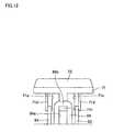The twoframe elements86 are formed such that they are symmetrical with respect to the longitudinal and lateral directions of theframe member82. The oneframe element86 surrounds a single set of theprotrusions83, thecap attaching element84 and thespring attaching element85 formed on the upper half part of theframe member82, inFIG. 12. Theother frame element86 surrounds a single set of theprotrusions83, thecap attaching element84 and thespring attaching element85 formed on the lower half part of theframe member82, inFIG. 12. In addition, therespective frame elements86 are formed such that they are higher than the other parts near both of the longitudinal ends of theframe member82.