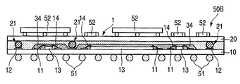 Moreover, thewire connecting pad11 and thebump connecting pad12 actually have such a structure as to be exposed from an opening portion formed on a solder resist disposed on thefirst substrate10. InFIGS. 1 and 2, they are shown to be protruded (exposed) from theupper surface10afor easy understanding.
