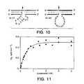 FIG. 8 illustrates the nucleotide sequences, cleavage sites, and turnover rates of two catalytic DNA molecules of the present invention, clones 8-17 (SEQ ID NO 134) and 10-23 (SEQ ID NO 136). Reaction conditions were as shown, namely, 10 mM Mg2+, pH 7.5, and 37° C. The DNAzyme identified as clone 8-17 is illustrated on the left, with the site of cleavage of the RNA substrate indicated by the arrow. The substrate sequence (5′,-GGAAAAAGUAACUAGAGAUGGAAG-3′ (SEQ ID NO 135))—which is separate from the DNAzyme (i.e., intermolecular cleavage is shown)—is labeled as such. Similarly, the DNAzyme identified herein as 10-23 is shown on the right, with the site of cleavage of the RNA substrate indicated by the arrow. Again, the substrate sequence is indicated (SEQ ID NO 135). For the 8-17 enzyme, the turnover rate was approximately 0.6 hr−1; for the 10-23 enzyme, the turnover rate was approximately 1 hr−1. Noncomplementary pairings are indicated with a closed circle (●), whereas complementary pairings are indicated with a vertical line (|).