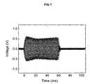 FIG. 7 shows the output signal of the measuringapparatus7 when theultrasonic transducer1 is driven to perform a regular wire-bonding process. Theultrasonic sensor4 may be located at aposition 10 mm in front of thebonding tool2. It is clearly seen that theultrasonic sensor4 can effectively detect the ultrasonic vibration of thebonding tool2, without influencing its performance, during the wire bonding process. From the output voltage signal, bonding parameters including the amplitude and duration of each ultrasonic burst can be determined and used to monitor the quality of the bonding.