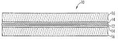 In one preferred embodiment of the present invention, a heating element is disposed on one side of the scrim layer prior to it's lamination to the foam layer on that side. Referring toFIG. 22, ascrim layer12 and twofoam layers14 are fed fromrespective rollers13 and15 to aflame lamination machine19. Upon enteringmachine19, a flame heats the layers so that they become sticky and nearly melt.Pinch rollers17 in the machine then press the layers firmly together. Upstream frommachine19, awire dispenser21 depositsheating element wire18 onto the upper surface ofscrim layer12. The dispenser moves reciprocally (in a direction into and out of the page) transversely across the scrim layer as it moves in the direction indicated byarrow25 toward the lamination machine, thereby depositing the heating element in a serpentine pattern on the scrim. The element, sandwiched between the scrim layer and foamlayer following rollers17, is fixed between the layers bylamination machine19. In another embodiment, the lower foam layer is added to the underside ofscrim layer12 by a second lamination machine downstream frommachine19.