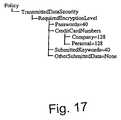 FIG. 17 shows an example illustration of policy data defining appropriate encryption strengths for various types of data. The policy data takes the form of a number of key-value pairs arranged on separate branches of the policy data tree. The key specifies the type of data that is being transmitted such as passwords, credit card numbers, submitted key words and a general key for any other submitted data. The values that correspond to these keys are the encryption strength in bits that is deemed appropriate for the transmission of the data specified in the key. The key value pairs are arranged on several branches of the RequiredEncryptionLevel branch of the TransmittedDataSecurity branch of the policy data tree. Thus, in the example, it may be seen that passwords have a desired encryption strength of 40 bits, company credit card numbers and personal credit card numbers both have a desired encryption strength of 128 bits, submitted key words have a desired encryption strength of 40 bits and other submitted data requires no encryption.