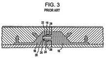 Turn now toFIG. 5 for a depiction of components of a direct pressure laminate product. Such products are typically fabricated from abase board34, beneficially a medium or high density fiberboard or chipboard. One or more kraft paper sheets36 (for clarity,FIG. 5 shows only one kraft paper sheet) impregnated with selected resins are located on and/or under thebase board34. A decorativecellulose paper sheet38, about 0.15 mm thick and impregnated with a melamine solution, is on thebase board34. Over the decorativecellulose paper sheet38 are one or moreprotective overlay sheets30. The protective overlay sheet(s) are made of a highly resistant paper having corundum (AL2O3) impregnated in a melamine solution. It is also possible to include different papers between the decorative cellulose paper sheet and the base board.