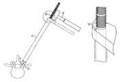 The location of the transverse guide mark on the spatula can thus be located on various parts of the spatula. In one specific embodiment, the transverse guide mark is located on the spatula so when aligned with the proximal end of thedrill guide301, the opposable teeth of the drill guide are approaching the skin of the patient. In another specific embodiment, the transverse guide mark when aligned may indicate that the opposable teeth of the drill guide are approximately at the fascia of the patient. In another specific embodiment, the transverse guide mark when aligned may indicate that the opposable teeth are approximately at the muscle of the patient. In another specific embodiment, the transverse guide mark when aligned may indicate that the opposable teeth are approximately at the facet joint of the patient. In another specific embodiment, the transverse guide mark when aligned may indicate that the opposable teeth are approximately fully within of the patient. In another specific embodiment, the transverse guide mark when aligned may indicate that the opposable teeth are approximately about 10 mm within the facet joint of the patient.