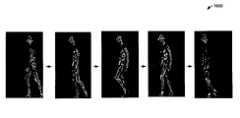 The techniques discussed above should not be construed as limiting, as there exist several suitable techniques that can be used to extract one or more motion signatures from the images inprocess block2012. For example, any of the gait signature extraction and detection techniques discussed and cited in Wang, J. J. and Singh, S., “Video Analysis of Human Dynamics: A Survey,” (available at http://citeseer.ist.psu.edu/715203.html); Moeslund, T. and Granum, E., “A Survey of Computer Vision-Based Human Motion Capture,”Computer Vision and Image Understanding, Volume 81,Issue 3, pp. 231-268 (March 2001) (also available at http://citeseer.ist.psu.edu/moeslund01survey.html); Bray J., “Markerless Based Human Motion Capture: A Survey,” (available at http://www.visicast.co.uk/members/move/Partners/Papers/MarkerlessSurvey.pdf); Dawson, M. R., “Gait Recognition: Final Report,” (available at http://www.doc.ic.ac.uk/teaching/projects/Distinguished02/MarkDawson.pdf); Nixon, M. S. et al, “Automatic recognition by gait: progress and prospects,”Sensor Review, vol. 23, number 4, pp. 323-331 (2003); Cunado, D., et al., “Automatic extraction and description of human gait models for recognition purposes,”Computer Vision and Image Understanding, pp. 1-41 (2003); or U.S. Patent Application Publication No. 2005/0210036, which are all incorporated herein by reference, can be used (at least in part) in embodiments of the disclosed technology. It should therefore be understood that the disclosed technology is not limited to any one particular modeling and/or extraction technique but encompasses all suitable known and hereinafter discovered techniques as would occur to those skilled in the art.