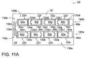 Referring back toFIG. 11A, thesubstrate surface32 can also have more than one row, for example, afirst row136aofbattery cells22a-dand asecond row136bofbattery cells22e-hthat are electrically connected to one another by anelectrical connector strip130dthat is a U-shaped strip which connectsadjacent battery cells22d,22eat first ends138a,bof the first andsecond rows136a,b, respectively. Thebattery cells22aand22hat the second ends140a,bof the first andsecond rows136a,bare terminated with a negative terminal88aand apositive terminal88b, respectively. The negative terminal88aand positive terminal88ballow electrical connection of thebattery20 to the external environment.