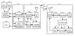 The exemplary block diagram of the data channel architecture as shown inFIG. 6 is one of numerous architectures which support data encoding and modulation on the reverse link. For high rate data transmission, an architecture similar to that of the forward link utilizing multiple orthogonal channels can also be used. Other architectures, such as the architecture for the reverse link traffic channel in the CDMA system which conforms to the IS-95 standard, can also be contemplated and are within the scope of the present invention.