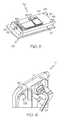 The shape ofslot97 is such that whenlatch90 is rotated indirection101, withhook portion98 capturingpost92, post92 is pulled generally radially inwardly toward the pivot axis oflatch90 to firmly seat the associatedmodule50,52 against themain housing18 and to pull theelectrical connectors59,61 together. On the other hand, whenlatch90 is rotated indirection103, withhook portion98 capturingpost92, post92 is pushed generally radially outwardly way from the pivot axis oflatch90 to unseat the associatedmodule50,52 from housing and to push theelectrical connectors59,61 apart. After being unseated in this manner, themodule50,52 is far enough away frommain housing18 to provide space for a user to grasp themodule50,52, as shown inFIG. 7awith regard tomodule50, and completely detach it fromhousing18.