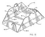 By way of a final packaging example, thefoldable tray1 is bent to create a package110 having a single area suitable to carry tall baked goods such as a pound cake, or the like. In this case, and referring concurrently toFIGS. 1 and 13, the carrying area of package110 corresponds to the first interior rectangle ofFIG. 1 established by the four sides (i.e., perimeter lines)18-1 . . .18-4. To create the package110, a first pair ofopposite corners5 of thesquare tray1 are bent upwardly along fold lines16-3 and16-7. The second pair ofopposite corners5 oftray1 are bent upwardly along fold lines18-2 and18-4 which correspond to the long sides of the first interior rectangle ofFIG. 1. The second pair ofcorners5 are then bent and rotated downwardly at fold lines16-1 and16-5 for interlocking receipt by respective openings through thetray1 formed below the push-downtabs14.