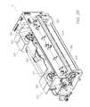 FIG. 3 is a perspective of thecomplete printhead cartridge2. Theprinthead cartridge2 has atop molding44 and a removableprotective cover42. Thetop molding44 has a central web for structural stiffness and to provide textured grip surfaces58 for manipulating the cartridge during insertion and removal. The base portion of theprotective cover42 protects the printhead ICs (not shown) and line of contacts (not shown) prior to installation in the printer.Caps56 are integrally formed with the base portion and cover the ink inlets and outlets (see54 and52 ofFIG. 5).