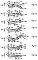 FIG.12FIG. 12 shows a side view of sequence of seven different stroke positions a, b, c, d, e, f, and g of the kick cycle of a prior art swim fin having a highly flexible load bearing blade that permits high levels of blade deflection to occur during light kicking strokes, but lacks the methods of the present invention and therefore exhibits high levels of lost motion, wasted energy, and poor propulsion.