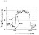 FIG. 3 shows a single typical example of simultaneous recordings of upper airway pressure and PCWP as a function of time before, during and after the straining phases of the Valsalva maneuver.FIG. 4 shows portions of a similar recording on an expanded time scale. At the initiation of the Valsalva maneuver (Phase I), upper airway pressure abruptly rises, and is maintained at greater than about 40 mm Hg for more than about 10 seconds (plateau or Phase II), and then upon release of the obstruction and resumption of breathing, airway pressure falls abruptly to its baseline of zero gauge pressure (atmospheric pressure).