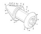 Thebody46 extends longitudinally between thetip42 and thecap44 and is essentially cylindrical in external configuration with a uniform and constant circular external cross-section between flared forward andrearward junctions58 and59 respectively joining opposite ends of thebody46 to thetip42 and thecap44. As best seen inFIG. 5, theforward junction58 has a concave curvature from the outer circumferential surface of thebody46 to therearward end surface53 oftip42. Therearward junction59 has a concave curvature from the outer circumferential surface of thebody46 to a distal orforward end wall62 ofcap44. Thejunctions58 and59 respectively provide a smooth, gentle and gradual transition between the outer circumferential surface of thebody46 and therearward end surface53 oftip42 and thedistal end wall62 ofcap44. The outer or external diameter of thebody46 is less than the maximum external diameter oftip42 and is less than the outer or external diameter ofdistal end wall62 as explained further below. Thebody46, including the forward andrearward junctions58 and59, has a length between therearward end surface53 oftip42 and thedistal end wall62 ofcap44.