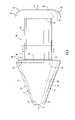 Eachdepression74 has a continuously curving bottom surface orfloor75 extending beneath the outer surface of themain section48, and a pair ofside walls76 extending from thefloor75 to the outer surface of themain section48. Thefloor75 of eachdepression74 has a continuously curving concave curvature between forward and rearward edges77 and78 of the depression at which thefloor75 joins the outer surface of themain section48 as best shown inFIGS. 3,6 and7. The forward and rearward edges77 and78 are parallel to each other as well as being perpendicular to the central longitudinal axis XD of the depression. Thefloor75 of eachdepression74 has a radius of curvature R4, and eachdepression74 has a maximum depth D between thefloor75 and the outer surface of themain section48 as illustrated inFIG. 6. Eachdepression74 has a width W between itsparallel side walls76, which are perpendicular to the forward and rearward edges77 and78 as seen inFIG. 7. Also, thedistal tip42 has a minimum wall thickness Tmin in a perpendicular direction from a line tangent toconcave taper72, where theconcave taper72 joins the side wall of thepassage68, to thefloor75 as depicted inFIG. 6. Preferably, the maximum depth D for the floor of the depressions is equal or substantially equal to the width W of the depressions.