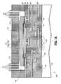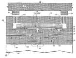 More specifically, referring toFIG. 1A, an exemplary semiconductor device (100) is shown, which comprises a substrate (101) (e.g., silicon, SOI, etc.) having active devices (102) (e.g., transistors, diodes, varactors, etc.) formed in a surface thereof, and local interconnect layers (103) connecting the active devices (102). The device (100) further comprises a plurality of metal interconnect layers (104) and inter-level vias (106) to connect active and passive devices of integrated circuits, which are formed in inter- and intra-level dielectric (ILD) layers (105) (SiO2, SiN, SiON, or other organic insulators, etc.), and a final conducting layer comprising elements (107) and (108). The interconnecting wires (104), vias (106) and final conduction layer (107), (108) may be made of Al, AlCu, Cu, W, or any conductive material or combination of such materials that are commonly used in IC fabrication. It is to be understood that the number and structure of layers of interconnecting wires (104), inter-level vias (106), and ILD layers (105) depicted inFIG. 1A is arbitrary and merely exemplary.