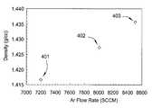 According to an embodiment of the invention, one important benefit of this method is the ability to increase the density, and therefore dry etch selectivity, of a-C:H films.FIG. 4 is a graph demonstrating the effect of an argon diluent gas on a-C:H film density. Film density for three 300 mm semiconductor substrates401-403 is illustrated. Processing conditions for all three substrates, including chamber pressure, radio frequency (RF) plasma power, hydrocarbon precursor, and hydrocarbon flow rate, were identical except for the flow rate of argon into the processing chamber during the deposition process. Argon flow rate during deposition onsubstrate401 was 7200 standard cubic centimeters per minute (sccm) and was increased to 8000 sccm and 8500 sccm forsubstrates402 and403, respectively. Relative tosubstrate401, film density forsubstrates402,403 is increased proportionate to the higher argon flow rates applied during the processing thereof. This indicates that the density of an amorphous carbon film can be increased by the addition of a relatively large flow rate of argon diluent without altering other process variables, such as hydrocarbon precursor flow rate or RF plasma power.