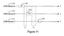 FIG. 11 depicts a diagrammatic representation of UWB device transmissions that include natural, or non-coordinated, silent periods that may be exploited for identifying interferers in accordance with an embodiment; and