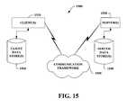 FIG. 15 is a schematic block diagram of a sample-computing environment1500 with which the subject invention can interact. Thesystem1500 includes one or more client(s)1510. The client(s)1510 can be hardware and/or software (e.g., threads, processes, computing devices). Thesystem1500 also includes one or more server(s)1530. The server(s)1530 can also be hardware and/or software (e.g., threads, processes, computing devices). Theservers1530 can house threads to perform transformations by employing the subject invention, for example. One possible communication between aclient1510 and aserver1530 can be in the form of a data packet adapted to be transmitted between two or more computer processes. Thesystem1500 includes acommunication framework1550 that can be employed to facilitate communications between the client(s)1510 and the server(s)1530. The client(s)1510 are operably connected to one or more client data store(s)1560 that can be employed to store information local to the client(s)1510. Similarly, the server(s)1530 are operably connected to one or more server data store(s)1540 that can be employed to store information local to theservers1530.