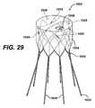 Stent1016 may further include at least two but preferably eight (as shown inFIG. 28) spaced apartlongitudinal legs1028. Preferably, there is a leg extending from each apex1030 of diamonds formed bystruts1018. At least one leg, but preferably each leg, includes aflange1032 adjacent its distal end which allows for thestent1016 to be retrievable into its delivery apparatus after partial or nearly full deployment thereof so that it can be turned, or otherwise repositioned for proper alignment.