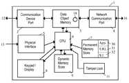 The network security device of the invention has at least onecommunication device port2, which communicates with communication device(s)12. Depending on the application, a plurality ofcommunications ports2 could be provided, possibly connected by an internal or external router, hub or switch, to allow more than onecommunication device12 to connect to a singlenetwork communication device1. This port could use any desired communication arrangement, depending upon the needs of the network and the current technology. For example, the port could be an Ethernet port, or a serial, parallel or USB port, or an 802.11 or Bluetooth wireless connection, an infrared transceiver, or any other appropriate connection as might be developed in the future.