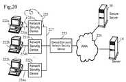 In this configuration, then, a security indicator—a simple flag, bit, suffix, or other piece of add-on datum—may be affixed to the traffic traveling BETWEEN network security devices221a-221n. For example,network security device222bis sending outbound traffic, so it attaches a checksum verifier or some sort of encryption key to the traffic, and sends it to the “command”network security device223 for transmission to thewide area network226. Before transmitting the traffic, thecommand device223 performs a verification to make sure the traffic came from a network security device221a-221n(and not a computer bypassing a network security device), by making sure that the traffic contains the security indicator. If the security indicator is present, the central commandnetwork security device223 passes the traffic to theWAN226 after stripping the security indicator from the traffic. If the security indicator is not present, the central command network security device may be programmed to notify asecure server19, or other user(s), or to take other actions such as refusing to accept further traffic from the offendingcomputer222a. This method could also be combined with the method of sending “decoy” traffic, explained in connection withFIGS. 11a-c.