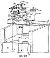 FIG. 22 is a perspective view of an alternative embodiment of a coin collecting machine with the upper portion of the cabinet removed, and illustrating a fill tray assembly.