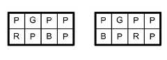 Although the minimal repeating units used to describe the present invention to this point are all two rows of four pixels per row arranged in a rectangle, there are alternative equivalent minimal repeating units. For example,FIG. 11A shows a minimal repeating unit of the present invention that is equivalent to the minimal repeating unit ofFIG. 7A as tiled inFIG. 8D. In addition,FIG. 11B is equivalent toFIG. 7B ifFIG. 7B is tiled similar toFIG. 8D, andFIG. 11C is equivalent toFIG. 10A ifFIG. 10A is tiled similar toFIG. 8D.