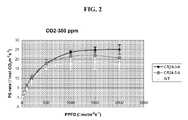ResultsAs shown inFIG. 2, transgenic line CR24-3-6 had a PS rate that was higher than a non-transgenic control at light intensities of 500 μmol m−2s−1to 2000 μmol m−2s−1and 380 ppm CO2. The PS rate appeared to decrease at 2000 μmol m−2s−1for control plants but not for CR24-3-6 plants. The PS rate for line CR24-5-6 was also consistently higher than the rate for controls at 500 through 2000 μmol m−2s−1and 380 ppm CO2.