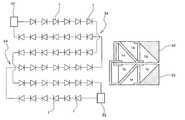 FIG. 30 shows a two-dimensional arrangement in a configuration employing AC drive and a total of 6 LEDs.FIG. 31 is a circuit diagram of this configuration. In this configuration also,air bridge lines28 at the ends (γ portion) are commonly formed. It can be considered that in this configuration also, ann electrode24 in the first LED array and ann electrode24 of the second LED array are shared.