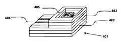 FIG. 4 illustrates asensor405 in the cavity of a stepped MLCC package in accordance with aspects of the embodiments. For ease of processing theMLCC package401 is formed from six ceramic layers of equal thickness. The stepped package has thelower layers402 being longer than otherupper layers403. Theupper layers403 form a cavity into which asensor405 is placed. One or more of the lower layers have been processed to provide internal bond pads, internal interconnects, and external connection points404.