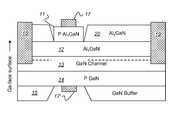 On an opposite side of thep GaN layer14 is aGaN channel layer13, which can have a thickness of between about 1 nm and 50 nm, such as about 10 nm. A layer of AlxGaN12 adjacent to theGaN channel layer13 and opposite to the p-typeGaN cap layer14 contributes to the 2DEG in theGaN channel layer13. The p-type AlzGaN cap11 is on the layer of AlxGaN12, in the gate region and undergate17. The break in the 2DEG indicator line under the gate, shows that there is no charge under the gate at zero bias on the gate and that the device is an enhancement mode or normally off device. (A dashed line in each figure, other thanFIGS. 20 and 22, indicates the 2DEG) Each of the III-nitride layers can be epitaxially grown on one another.