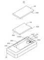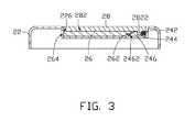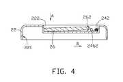 Referring also toFIG. 3, thebattery26 is substantially a planar board in shape. Thebattery26 has afirst end262 and asecond end264 opposite to thefirst end262. Thefirst end262 is a wedge wall and may resist the resistingsurface2462 of the resistingportion246. Thesecond end264 may resist thesecond sidewall226 of thehousing22.