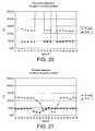 EXAMPLE 4Bubble DetectionFIG. 21 shows what happens if a bubble is passing through the pump. Data points #18-23 show the normal situation where the patient needle is filled with liquid and no bubbles are present in the pump. At data point #23 an air bubble enters the pump inlet. At this point the inlet stroke duration lowers significantly due to the lower viscosity of air compared to liquid, e.g. insulin. Atdata point #24 the same effect is seen at the outlet stroke duration. Atdata point #28 all rests of the bubble is cleared from the inlet channel and atdata point #33 all bubble rests are cleared from the outlet channel. In both cases the shift from partly air (bubble) to no air gives leads to a significant rise in stroke duration because of the different viscosity. One of these signals or a combination of them can be used for detecting if a bubble is entering or passing through the pump. Although a single bubble may not represent a malfunctioning of the pump or the pump-reservoir system, the above example shows that the principles of the present invention can be used to detect even very minor events.