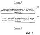 FIG. 9 is a flow chart illustrating exemplary program steps used to select at least one of the plurality of video programs for VOD service. As described earlier herein, thereceiver200 stores a program guide which presents a description of the video programs available for viewing now and for a period of time in the future to the viewer. Each of the video programs includes a SCID, which identifies that program. By selecting the SCID, the receiver is set to retrieve the video program segments associated with the SCID for viewing. An indicator such as a flag, a bit or word can be associated with each video program in the program guide for which VOD services are desired. In one embodiment, the indicator may be placed in the program guide by thecontrol center102 before the program guide is downloaded in thereceiver200, either through the PSTN link120 or thedownlink118. The program guide is then scanned902 to find the VOD service indicator. Video programs associated with a VOD service indicator are then identified as programs to be recorded for VOD service, as shown inblock904.