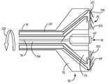 FIG. 5D illustrates theprong support105 and a plurality ofprongs100. A portion of an interior housing support75 (see alsoFIG. 5B) is shown relative to theprong support75. As illustrated, theprong support105 is forward of theinterior housing support105. The protrudingtab82 extends from a rear surface (as illustrated) of theprong support105 towards theinterior housing support75. Thedetent80 is provided within theinterior housing support75 and is configured to receive the protrudingtab82.FIG. 5D illustrates theprong support105 prior to complete rotation in the direction ofarrow120. At this point, rotation in either direction is permitted.FIG. 5E illustrate protrudingtab82 engaged within thedetent80. Rotation in either direction is now precluded.