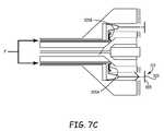 FIG. 7B schematically illustrates theprongs300 prior to deployment. Anchor recoil springs305 are either free of tension or as illustrated, retain theprongs300 in a proximal position. InFIG. 7C, force has been applied in the direction of arrow F. Theprongs300 have pierced the fossa ovalis and the force applied by theprong deployment mechanism58 is reduced or eliminated. The anchor recoil springs305 are compressed in the process and consequently, exert a force in a direction opposite that indicated by arrow F. As such, the anchor recoil springs305 exert this force against theprongs300, causing them to move in a proximal direction. As thetabs355 are pivotablly coupled to theprong300, this movement causes thetabs355 to engage the tissue of thefossa ovalis36 surrounding the piercing point and open as shown. In this manner thetabs355 are anchored against the wall of thefossa ovalis36 within theleft atrium40. As such, thepressure sensor60 is maintained in the appropriate position.FIG. 7D illustrates the piercingheads315 and anchoringtabs355 for each of theprongs300a-300d. Because the piercingheads315 andtabs355 protrude minimally into theleft atrium40, they will typically not disrupt fluid flow in such a manner as to generate clotting. Furthermore, over time tissue growth will encapsulate the piercing heads315 andtabs355 serving both to further anchor theassembly70 and to obviate the presence of a foreign body in the left atrium. It should be appreciated that the anchor prongs52 ofFIGS. 4A-4D could be utilized in a similar manner. That is, rather than deploying into the fossa limbus, the anchor prongs52 could deploy into and/or through the fossa ovalis36 to secure thehousing70. For example, the anchor prong tract55 (FIG. 4B) could continue linearly rather than angling parallel to thefossa ovalis36. Alternatively, thehousing70 could be reconfigured such that a portion of thehousing70 is in contact with thefossa limbus38 so that the above described anchor prong variation pierces thefossa limbus38. The remainder of thehousing70 would be configured so that contact is still maintained between thesensor60 and the fossa ovalis or as described below, thesensor60 is advanced forward of thehousing70 to contact thefossa ovalis36.