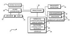 Theproximity detector36 is connected to theprocessor20 and, in accordance with the various embodiments utilizing the technical features described herein, may be operable to determine whether thewireless configuration device2 is outside of a predetermined distance (i.e., outside of 12 inches) of either the access point6 or thewireless client device10, prior to transmitting the request signal for thenetwork connectivity settings40 to the access point6 and prior to transmitting thenetwork connectivity settings40 to thewireless client device10. It will be understood by those skilled in the art that theproximity detector36 may utilize any of a number of known technologies for proximity detection. For instance, according to various embodiments, among others, theproximity detector36 may comprise a non-contact type proximity detector utilizing reflected photoelectric (e.g., infrared) or ultrasonic signals which detects objects in a close proximity to thewireless configuration device2.