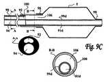 FIG. 9C illustrates another embodiment of the bitumen configuration described hereinabove. In this case, the catheter further comprises a connectingtube segment100 positioned between the conduit proximal portion (i.e. bitumen conduit)90 and the proximal attachment point of theballoon96. Said connecting tube segment, shown in cross-sectional view in the lower right portion ofFIG. 9C, contains two concentrically arranged conduits: an outer conduit having alumen106 that is in fluid communication with thefluid passage lumen92 of theproximal bitumen conduit90, and an inner conduit formed by the elastic section-containingdistal conduit99d, thelumen91dof which is in fluid communication with theguidewire lumen94 of saidbitumen conduit90. As seen in the figure, the presence of connectingtube segment100 permits the use of a longerdistal conduit99dthan is possible in the embodiment depicted inFIG. 9A.
