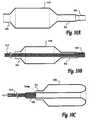 FIGS. 19A-C schematically illustrate the collapse of the proximal tapers of a balloon, and restriction of the withdrawal of the balloon through the insertion sheath caused by the collapse of the proximal tapers.