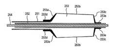 In certain embodiments, bothproximal taper253aanddistal taper253cmay have an average wall thickness that is greater than the average wall thickness ofmidsection253b. In preferred embodiments, the average thickness of the wall ofproximal taper253amay be greater than the average thickness of the wall ofdistal taper253c, and the average thickness of the wall ofdistal taper253cmay be greater than the average thickness of the wall ofmidsection253b.