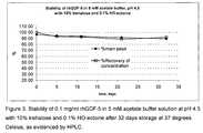 FIG. 3 shows the stability of 0.1 mg/ml rhGDF-5 in 5 mM acetate buffer solution at pH 4.5 with 10% trehalose and 0.1% HO-ectoine after 32 days storage at 37 degrees Celsius, as evidenced by HPLC.