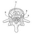 Referring toFIG. 2, anintervertebral disc14 includes aninner nucleus pulposus18 and anouter annulus fibrosus20. Theannulus fibrosus20 is made up of a number of bands that are arranged in a series of concentric layers to retain thenucleus pulposus18 and aid in resisting other forces placed on thespine10. In the lumbar portion of thespine10, thecauda equina22 runs through thevertebral canal16.Spinal nerves24 extend outwardly from thecauda equina22, withnerve roots26 proximate thecauda equina22. While a lumbar vertebra and associated disc are shown inFIGS. 2-4, the invention is equally applicable to other vertebrae and discs in the spine.