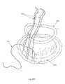 The steps of forming the various layers of the depicted sheath instrument are illustrated with steps A-L adjacent toFIGS. 283B and 283C. The first step (“A”) comprises placing anylon 12 jacket approximately 2-3 mils thick over the entire length (proximal and distal) of the mandrel. Next (“B”), polyimide tubes lined with PTFE are stuffed withrectangular mandrels 4 mil by 12 mil. These small mandrels are placeholders for the tension elements, to be installed later with the pertinent ring element to which they are soldered. The polymide-PTFE-lined mandrels are heat shrink bonded to the nylon jacket, subsequent to which (“C”) the proximal portion (proximal to the approximately two-inch more flexible distal section) is braided with 1×3 mil rectangular wire at 75 ppi diamond patter; the braiding is loosened in pattern over the distal section to 60 ppi (picks per inch), Next (“C+”), the distal section is covered with a later-to-be-removed heat shrink tubing layer, subsequent to which (“D”), the entire length of the sheath is braided again with the same wire at a 40 ppi rate. Next (“E”) a 3 milthick nylon 12 jacket is applied over the proximal portion (proximal of the subsequent position of the proximal ring), and the structure is heat fused (“F”) through a vertical heat shrinking device. Next (“G”) the distal heat shrink (from step “C+”) is removed along with any materials over it, and the pre-soldered proximal ring with set of tension elements is installed by pulling the small mandrels out and pushing/pulling the tension elements into the same positions, and subsequently encapsulating the proximal ring into place with a small cuff ofnylon 12 material. Next (“I”) rectangular reinforcing ribs (approximately 0.016×0.40 inches) are heat tacked into place along the sides of the portion of the sheath distal to the proximal ring, and subsequently (“J”) a 40 d low durometer Pebax jacket is heat fused over the portion of the sheath distal to the proximal ring. Subsequently (“K”) the distal ring and associated tension elements are installed similar to the installation of the proximal ring and tension elements, and (“L”) a short (approximately 1-2 mm long)soft tip 35 durometer section is heat welded to the distal end, followed by installation of a Luer assembly proximally, and the instrument base.