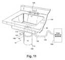 Referring now toFIG. 10, in an exemplary installationfood waste disposer10 is mounted to asink118. A volume of water is used to create a waste/water slurry which enhances discharge of the ground waste particles to adrain pipe120 or other discharge location. The source of water can be afaucet assembly122, the volumetric flow rate of which is manually controlled, or the water can be supplied along with the food waste from adish washing machine124 through adishwasher discharge line126 connected to thesecond inlet22 for subsequent grinding bydisposer10. Electrical power formotor24 is provided through anelectrical power cord128.