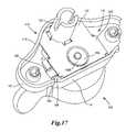 Referring toFIGS. 17-21, biasingmember164 is secured indeep recess portion173 between recess posts140. Biasing member may be any number of flexible materials possessing shape memory characteristics, such as, for example, a spring in the geometry depicted in an example embodiment of the present invention or in a variety of other geometries that would impart biasing uponcam followers219 orgear160 andcam158.Cam158 andcam followers219 are situated betweenflex regions150,152 of biasingmember164.Flex regions150,152 extend throughmain recess portion173A and intoside recess portions173B,C. Generally, the distance betweenflex regions150,152 is approximately the distance betweenobtuse corners158A,B ofcam158. In the embodiment depicted inFIG. 16, biasingmember164 also has curved joiningregion154. Although only one biasingmember164 is depicted inFIGS. 16-21, alternative embodiments may include a pair ofseparate biasing members164 — each biasingmember164 providing aseparate flex region150 or152 — secured indeep recess portion173 between recess posts140.